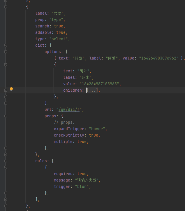 表单组件根据表格列对象配置的type值区分组合了:el-input、el-cascader、el-checkbox、el-data-picker,这些组件的属性都通过表格列对象配置,也支持字典