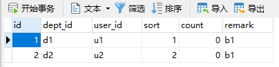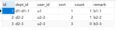 INSERT INTO test_1(`id`, `dept_id`, `user_id`,`sort`,`count`,`remark`) VALUES (1, 'd1', 'u1', 1, 0, 'b1');