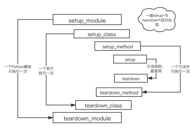 setup_module和teardown_module在整个模块中只执行一次, setup_class和teardown_class在类里面只执行一次,setup_method/teardown_method和setup/teardown 在每个方法前后都会被调用。一般用的最多的是方法级别和类级别。