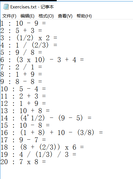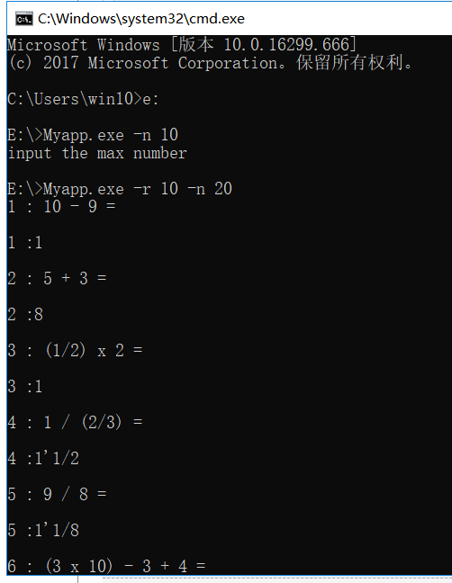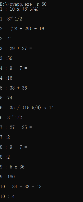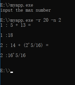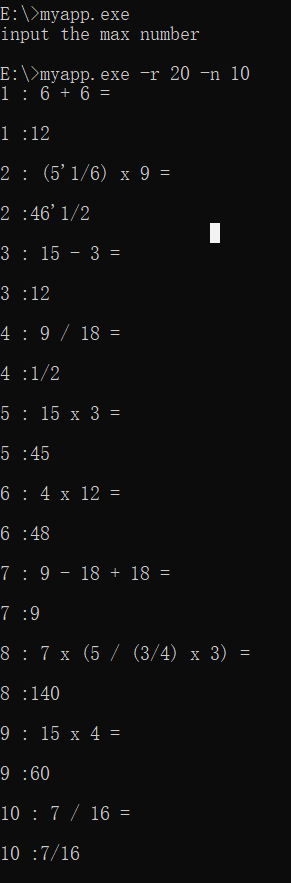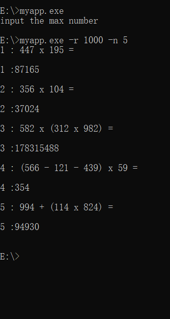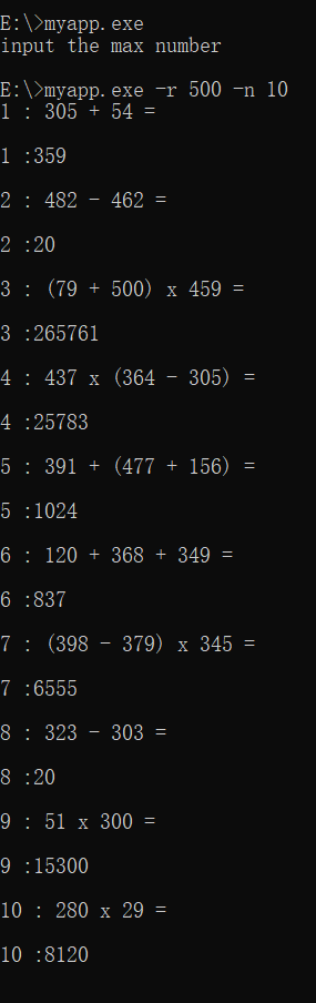 Myapp.exe -r 10 -n 20,表示生成20条最大值为10的运算式