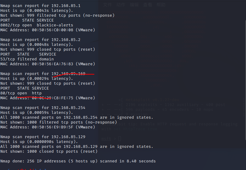 nmap进行主机扫描,发现存活主机192.168.85.169
