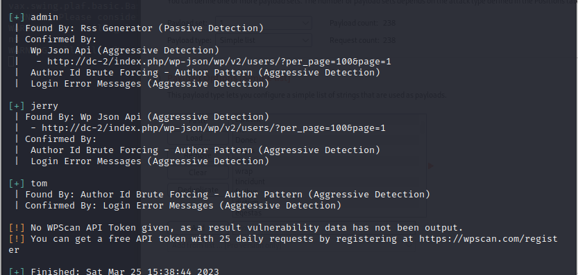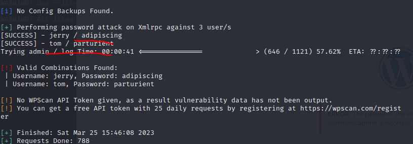 wpscan --url http://dc-2 -U user.txt -P pass.txt