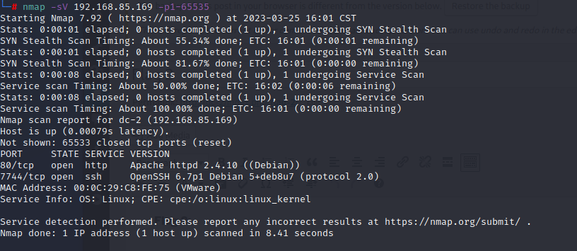 2.nmap对主机192.168.85.169进行端口扫描和服务扫描,发现还开放了7744是ssh服务,这题估计会用到ssh