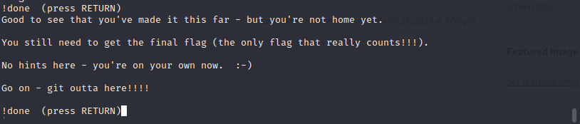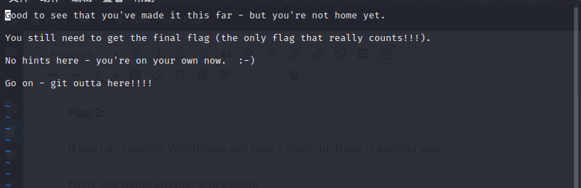 意思是你成功做到了这,但是这不是你的家,你仍然需要找到最后的flag,这是很重要的,这没有hints,你需要自己做,继续做吧,使用git走出这里