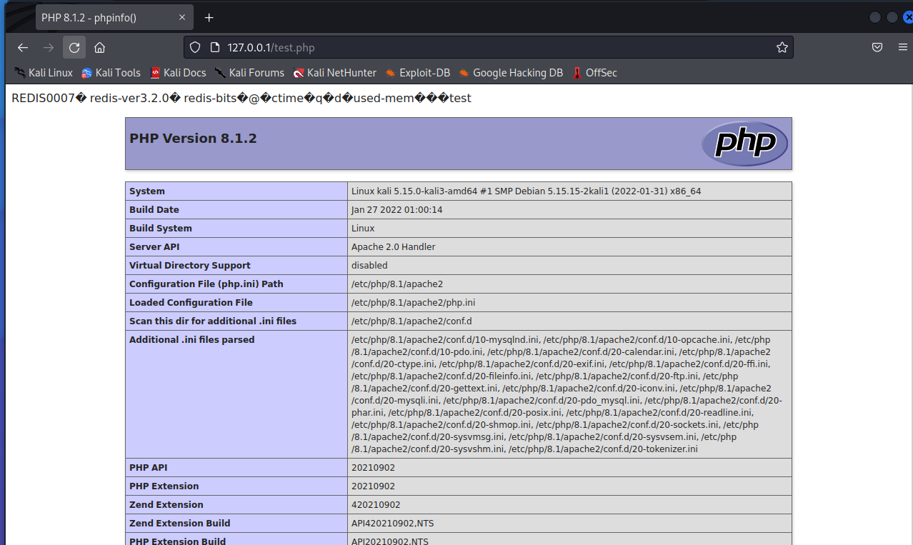set test "<?php phpinfo();?>" #设置写入文件代码