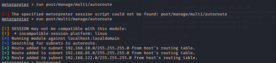 在已经取得了centos的权限时,进行信息搜集,发现192.168.10.0网段,因为没有路由,kali(攻击机)是无法访问192.168.10.0网段的,如果只是msf用的话只需要添加路由即可,但是如果想用其他工具,比如说nmap,就需要进行设置代理了