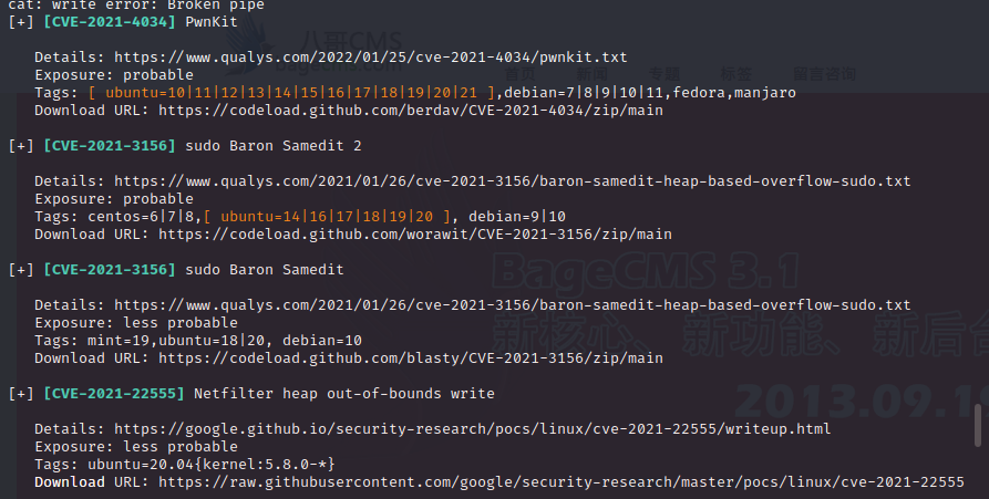 上传漏洞linux-exploit-suggeter探测脚本,说是有脏牛(cve2016-5195),失败,sudo(cve2021-3156)