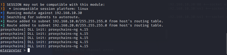 这里应该也是可以访问192.168.10.30,因为有路由。socks服务器是msf充当的,proxychains和sockscap只是全局代理工具,这个地方也可以继续用一个socks代理,即只开一个代理服务器,在第一个msf会话中。