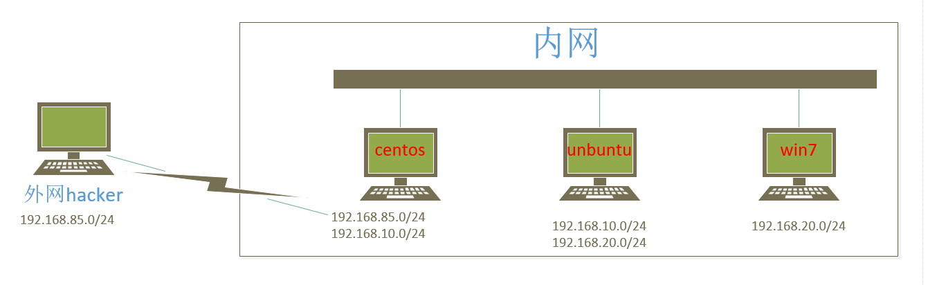 hacker主机能ping通centos,centos能ping通unbuntun,,unbtun能ping通win7,内网centos,unbuntu有两张网卡,在vmare通过虚拟网络编辑器新建三张网卡,关闭dhcp服务,一定要注意取消将主机虚拟适配器连接到此网络,新增加网络适配器,选择对应的网卡