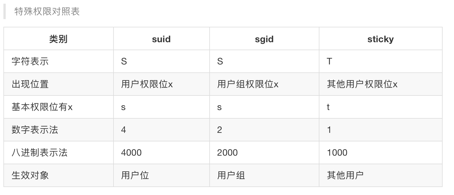 - 如果某文件,用户权限位本身就有x权限,给该文件设置suid权限时,则以小写s标识,否则就是大写的S字符。