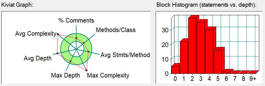 在该分析图中也可以发现,方法数/类数的比例过高:检查代码后发现,有部分原因是由于在每一个类中,每一个属性都设置了get和set方法,而其中有许多的get或者set并没有被使用,因此导致方法/类比例偏高,平均复杂度和深度也因此被拉低了一些,也导致了每个方法的平均语句偏低。