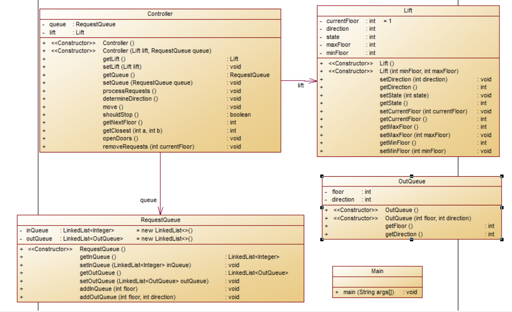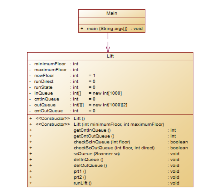 控制类(Controler):负责调动各个类,主要用于控制电梯的运行,方向确定,队列信息的输入删除以及各种消息的打印,判断电梯是否应该开门,删除到达该楼层需要去除的队列信息,确定下一个要去的楼层。