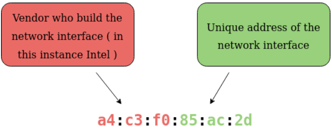 网络上的设备都有一个物理网络接口,它是设备主板上的一块微芯片板。该网络接口在其制造时被分配了一个唯一的地址,称为MAC地址。MAC地址是一个由十二个字符组成的十六进制数(在计算中用于表示数字的十六进制编号系统)分成两个并用冒号分隔。这些冒号被视为分隔符。例如,a4:c3:f0:85:ac:2d。前六个字符代表制作网络接口的公司,后六个是唯一编号。