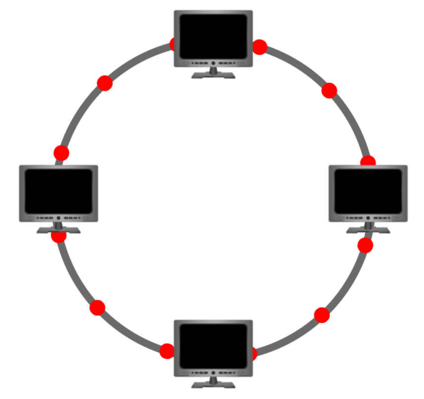 环形拓扑(也称为令牌拓扑)具有一些相似之处。计算机等设备直接相互连接形成环路,这意味着几乎不需要布线,也不太依赖星型拓扑中的专用硬件。