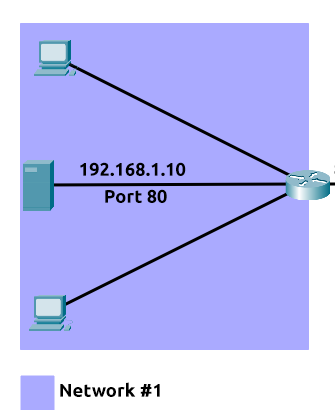 以下面的网络为例。在这个网络中,IP 地址为“192.168.1.10”的服务器在端口 80 上运行一个网络服务器。只有这个网络上的其他两台计算机才能访问它(这被称为内部网)。