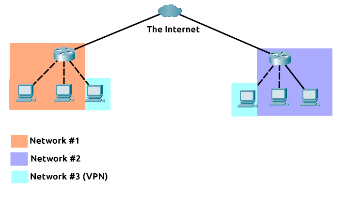 连接在网络 #3 上的设备仍然是网络 #1 和网络 #2 的一部分,但也一起形成一个专用网络(网络 #3),只有通过此 VPN 连接的设备才能通过该网络进行通信。