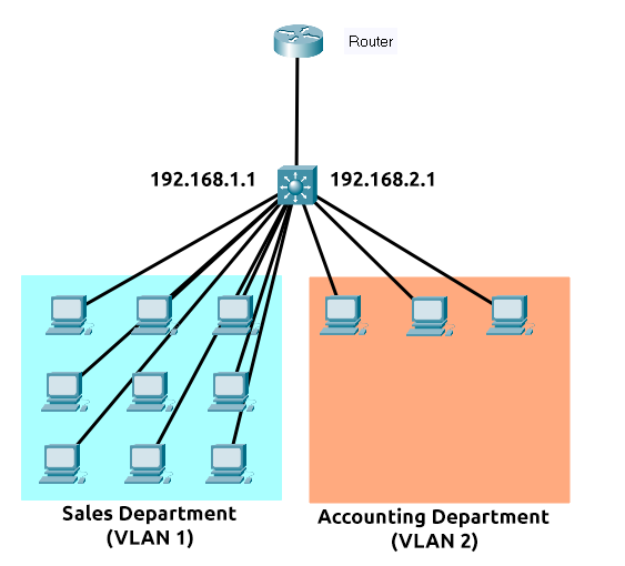 在上图中,“销售部”和“会计部”将能够访问 Internet,但无法相互通信(尽管它们连接到同一台交换机)。