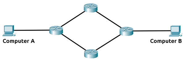 我们可以看到电脑A的网络是通过中间的两个路由器连接到电脑B的网络的。问题是:将采取什么路径?不同的协议将决定应该采取什么路径,但因素包括: