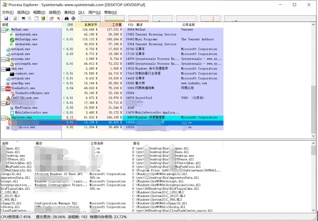 第一步:以某软件为列,先打开软件然后用procexp.exe软件打开找到该软件的运行名称,Ctrl+D查看详细信息,Ctrl+A另存为放到deal_dll.exe文件目录下