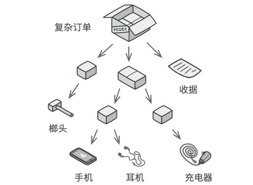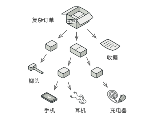 假如,有两类对象:产品和盒子。一个盒子可以包含几个产品或多个较小的盒子。这些小盒子也可以包含一些产品或更小的盒子,以此类推