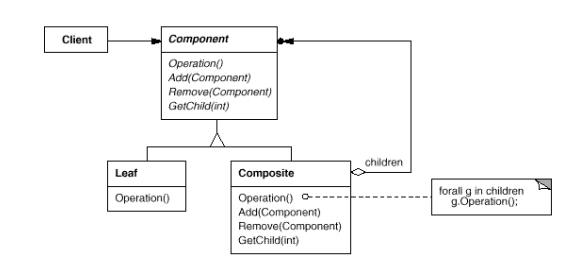 - 在类层次结构的根部定义子节点管理接口的方法具有良好的透明性,因为可以一致的使用所有的组件,但是这一方法是以安全性为代价的,因为客户可能会做一些无意义的事情,例如在leaf中增加和删除对象