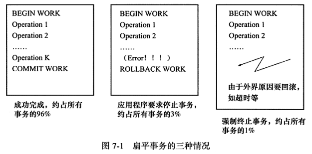 在扁平事务中,所有操作处于同一层次中,由BEGIN WORK开始,由COMMIT WORK 或 ROLLBACK WORK 结束,其间的操作是原子的,要么都执行,要么都回滚。