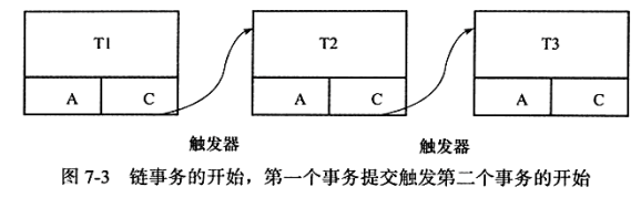 链事务的思想是:在提交一个事务时,释放不需要的数据对象,将必要的处理上下文隐式的传给下一个要开始的事务。提交事务操作和开始下一个事务操作将合并为一个原子操作。