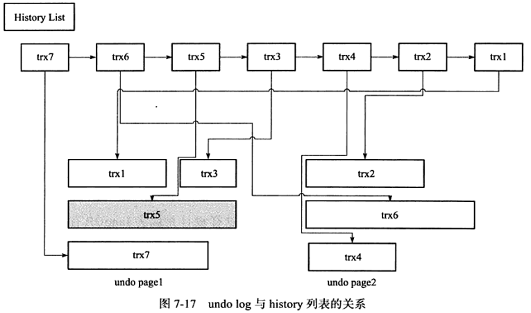 下图trx5灰色表示还有其他事务引用。在执行purge过程中。InnoDB存储引擎首先从history list中找到第一个需要被清理的记录,为trx1。之后会在undo log也页中查找可以清理的undo log,即trx3。由于trx5被占用,所以清理trx2, trx6, trx4。由于undo page 2都被清理了,所以可以被重用。