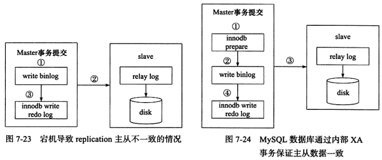 最常见的内部XA事务存在于binlog与InnoDB存储引擎之间。在事务提交时,先写二进制日志,再写InnoDB存储引擎的重做日志。对上述两个操作的要求也是原子的,即二进制日志和重做日志必须同时写入。若二进制日志写入了,而在写入InnoDB存储引擎发生了宕机,那么slave可能会收到master传来的二进制日志并执行,导致主从不一致,如图7-23所示。为了解决这个问题,MySQL数据库在 binlog与InnoDB存储引擎之间采用XA事务。当事务提交时, InnoDB存储引擎会先做一个PREPARE操作,将事务的xid写人,接着进行二进制日志的写入,如图7-24所示。如果在 InnoDB存储引擎提交前, MySQL数据库宕机了,那么 MySQL数据库在重启后会先检查准备的UXID事务是否已经提交,若没有,则在存储引擎层再进行一次提交操作。