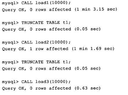 上面两个存储过程存在一个问题,当发生错误时,数据库会停留在一个未知的位置。另一个是性能问题,对于第一和第二种方法,每一次提交都要写一次重做日志,存储过程load1和load2实际写了10000次重做日志,而对于存储过程load3来说,只写了1次。
