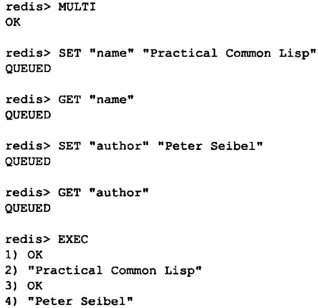 def EXEC(): # 创建空白的回复队列 reply_queue = [] # 遍历事务队列中的每个项 # 读取命令的参数,参数的个数,以及要执行的命令 for argv, argc, cmd, in client.mstate.commands: # 执行命令,并取得命令返回值 reply = execute_command(cmd, argv, argc) # 将返回值追加到回复队列末尾 reply_queue.append(reply) # 移除REDIS_MULTI 标识,让客户端回到非事务状态 client.flags &= ~REDIS_MULTI # 清空客户端的事务状态,包括: # 1)清零入队命令计数器 # 2)释放事务队列 client.msatate.count = 0 release_transaction_queue(client.mastate.commands) # 将事务的执行结果返回给客户端 send_reply_to_client(client, reply_queue)