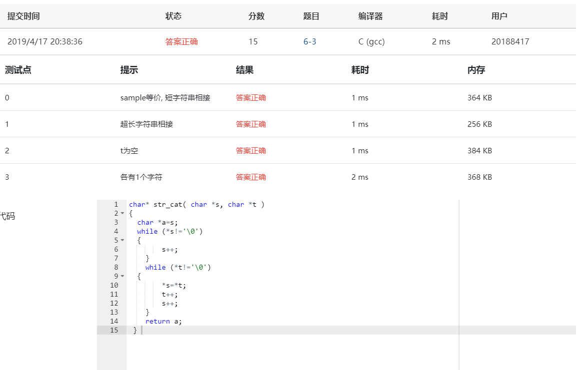 函数str_cat应将字符串t复制到字符串s的末端,并且返回字符串s的首地址。