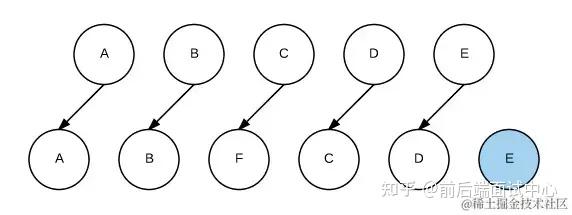 我们希望可以在 B 和 C 之间加一个 F,Diff 算法默认执行起来是这样的: