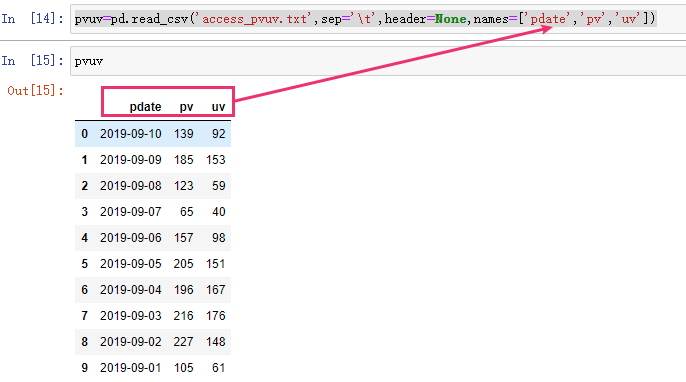 pvuv=pd.read_csv('access_pvuv.txt',sep='\t',header=None,names=['pdate','pv','uv'])