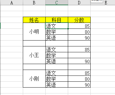 df.dropna(axis=0,how='all',inplace=True) ''' 姓名 科目 分数 0 小明 语文 85.0 1 NaN 数学 80.0 2 NaN 英语 90.0 4 小王 语文 85.0 5 NaN 数学 NaN 6 NaN 英语 90.0 8 小刚 语文 85.0 9 NaN 数学 80.0 10 NaN 英语 90.0 '''