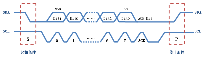 起始条件和停止条件一般由主机产生,总线在起始条件后被认为处于忙的状态,在停止条件的某段时间后总线被认为再次处于空闲状态。如果产生重复起始条件而不产生停止条件,总线会一直处于忙的状态,此时的起始条件(S)和重复起始条件(Sr)在功能上