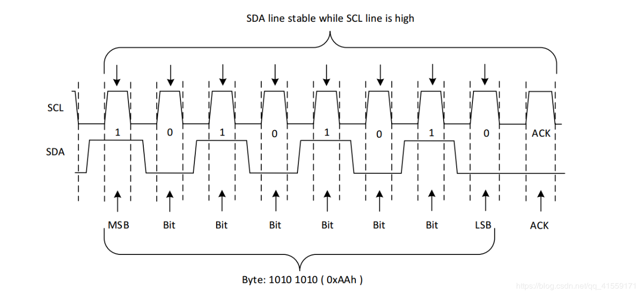 进行数据传送时,在 SCL 呈现高电平期间,SDA 上的电平必须保持稳定,低电平为数据 0,高电平为数据 1, SDA上的额数据表示传输的数据位,只有在 SCL 为低电平期间,才允许 SDA 上的电平改变状态。