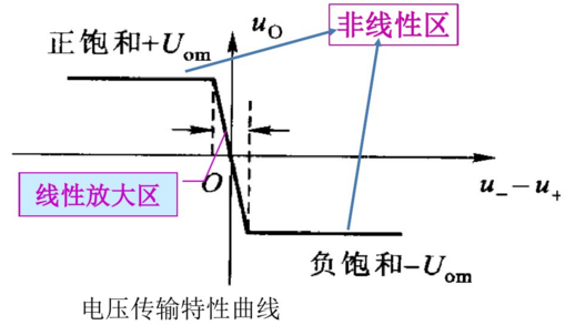 集成运算放大器的输出信号和输入信号之间的关系曲线,称为传输特性,其电压传输特性曲线如图: