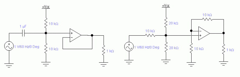 其实楼主画的两个图都能实现叠加2.5v的功能,只不过左边的图因为有电容隔离直流,不适合频率太低,右边的图需要完善。这两个图应该是楼主的设计意图了。VCC=5v,单电源运放LM358,LMV358等。