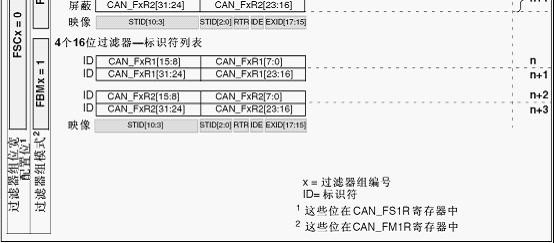 (4) 4个16位的列表模式的过滤器。在16位的列表模式下: 有4个过滤器。FxR1的[15-0]位配置过滤器0,FxR1的[31-16]位配置过滤器1。FxR2的[15-0]位配置过滤器2,FxR2的[31-16]位配置过滤器3。
