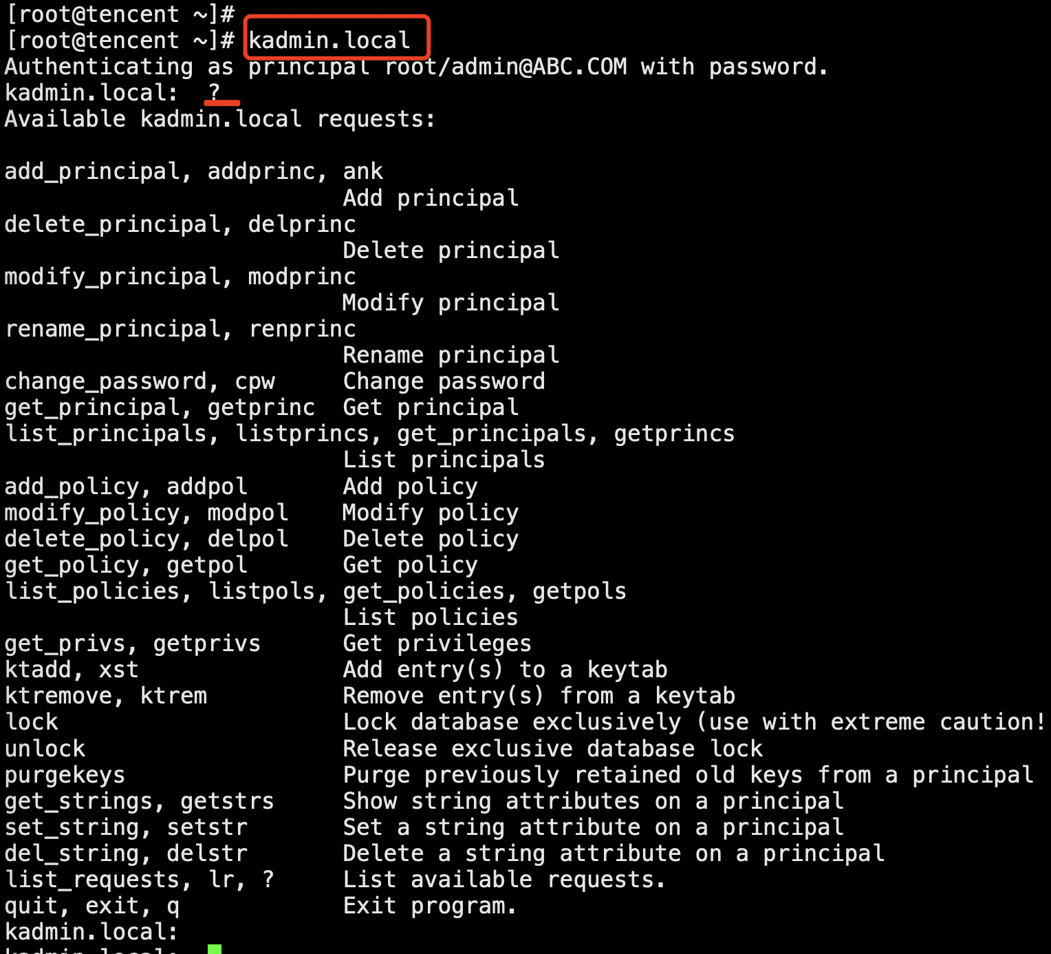 在运行kadmin的节点上执行如下命令,进入kadmin操作模式: