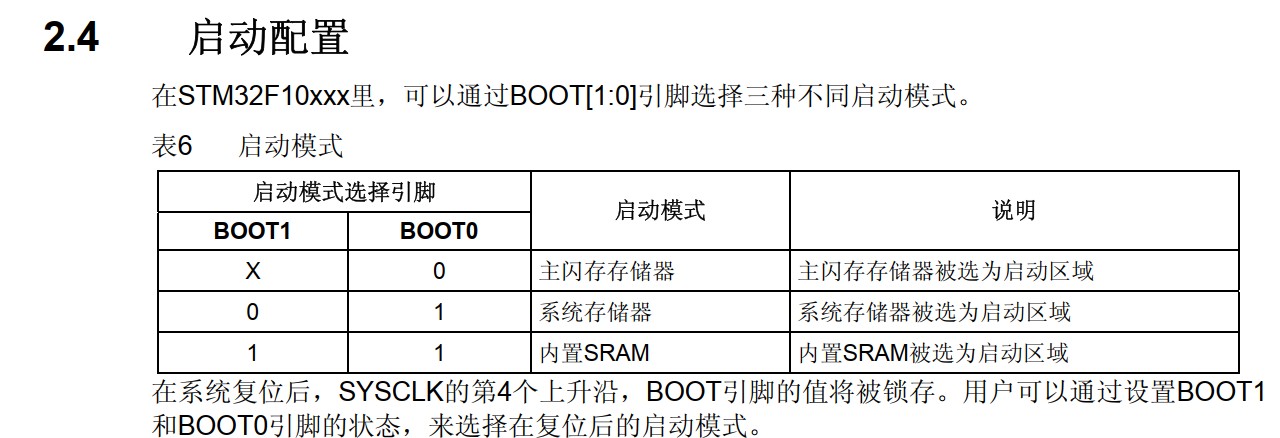 STM32支持三种启动方式,通过boot0和boot1两个引脚的高低电平组合来进行选择。通常使用主闪存启动方式,即flash启动(boot0=0,boot1=0)。