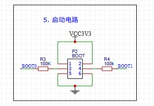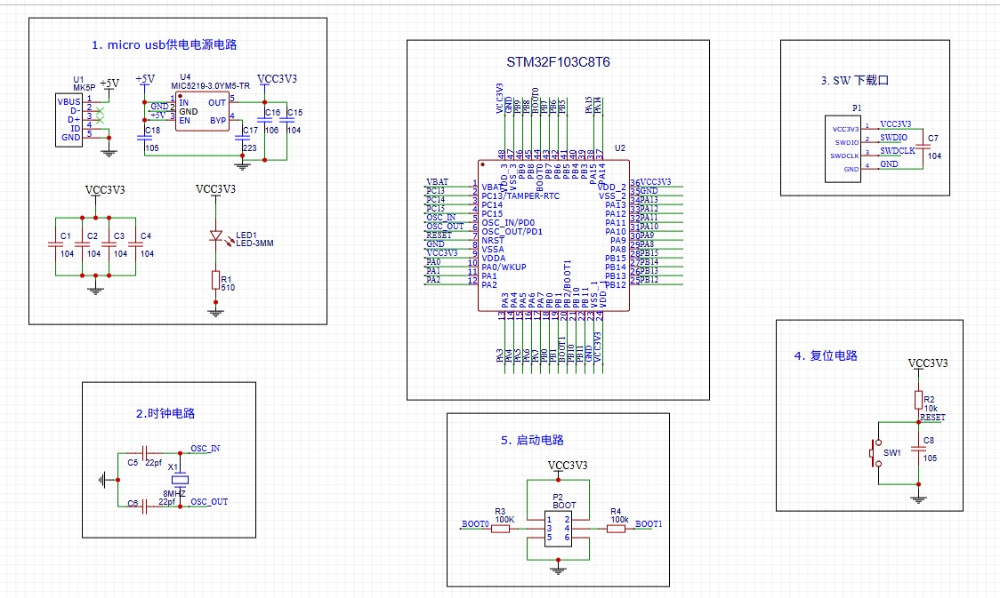 除开STM32F103C8T6芯片外,还需要图中的5个外围电路,单片机才能正常工作。