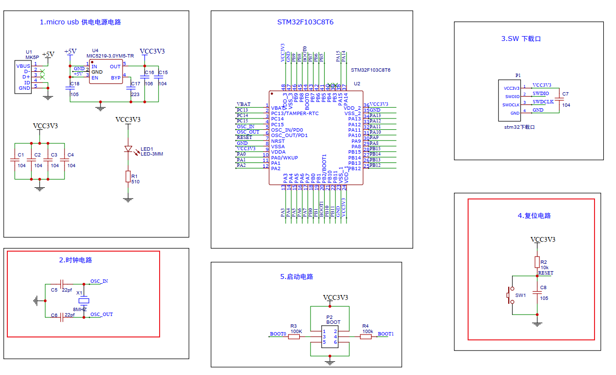 在上一节STM32最小系统中,讲解了STM32最小系统由:电源、时钟、下载、复位、启动五个部分组成,本文主要讲解时钟和复位两个部分,因为这两个部分和后续编程紧密相连,而电源、下载、启动三个部分相对固定,编程上不需要太多改动。