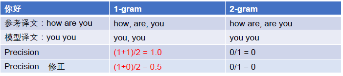 2-gram:将参考译文与模型译文 按照 每段2个词 分成片段。