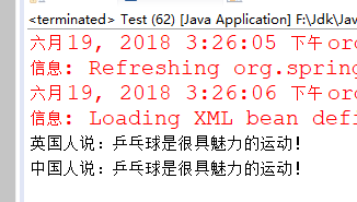 1 public class Test { 2 public static void main(String[] args) { 3 @SuppressWarnings("resource") 4 ApplicationContext ctx = new ClassPathXmlApplicationContext("applicationContext.xml"); 5 IPerson person0 = (IPerson) ctx.getBean("english"); 6 7 System.out.print("英国人说:"); 8 person0.playGameing(); 9 10 IPerson person1 = (IPerson) ctx.getBean("chinese"); 11 12 System.out.print("中国人说:"); 13 person1.playGameing(); 14 } 15 }