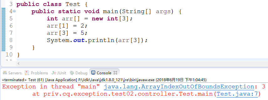 如上图所示,出现了ArrayIndexOutOfBoundException,这个异常是编译成功,运行时出现的异常,顾名思义,该异常意思是数组角标越界了,由于该异常是在运行时出现的异常,所以此类异常也叫作运行时异常,或非检查异常。类似的异常还有NullPointerException等。