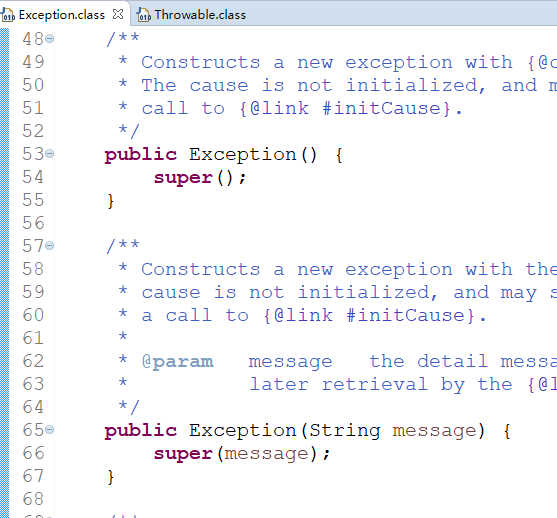 上面出现的几种异常不管是什么类型,都是Throwable的间接子类,都已经封装完毕,我们直接使用就行,但有时候我们系统根据需求会出现各种各样的异常,这时候就要自定义异常对象了。自定义异常,也是将异常进行封装,说白了就是用一个自定义的类对异常信息进行封装,该类继承Exception,只需要复写父类的构造方法即可,通过super将信息传入到参数。先来看看父类的构造是如何实现的: