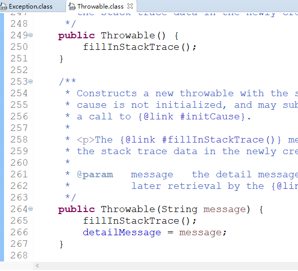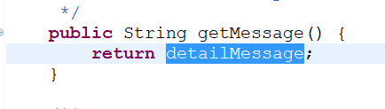 这就很明显了,我们在自定义异常类时,在构造方法中用super调用了该类的父类Exception中的构造方法,并将参数传入,在Exception中用super调用父类Throwable中的构造方法,并将参数传入,并将该实参值赋值给该类的detailMessage属性,在getMessage()方法中获取该值,所以也就有了"myException.getMessage()"(下文会提到)了,可以看得出来这个方法其实是调用的Throwable类中的方法。