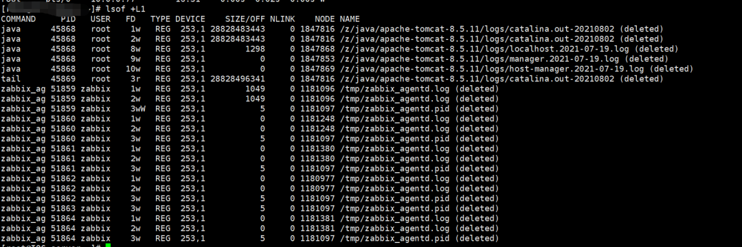 很明显,有空间被已删除文件占用,文件删除了,但是资源没释放。